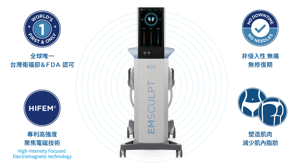 30分鐘的Emsculpt強化肌肉的效果遠勝過做2萬次肌肉鍛鍊。Emsculpt 肌動減脂,使用HIFEM「高能量聚焦磁場」技術,非侵入式治療,令肌肉產生高強度的擴張及收縮,刺激肌肉生長同時燃燒皮下7cm最深層的脂肪,重塑肌肉結構令肌原纖維生長。是首部儀器獲得美國食品藥物管理局(FDA)及歐盟(CE)等台灣衛福部(TFDA)多重核准認證,可增加肌肉鍛鍊及減少脂肪含量。此外,療程亦可改善產後媽媽的腹直肌分離困擾,是一台輔助肌肉鍛鍊的新科技。